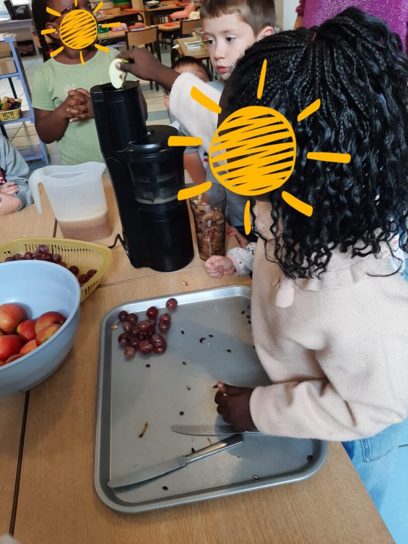Les élèves de GS/CP avaient préparé une collation de saison : un délicieux jus de pommes et de raisins frais, à déguster ensemble pour bien démarrer la journée.