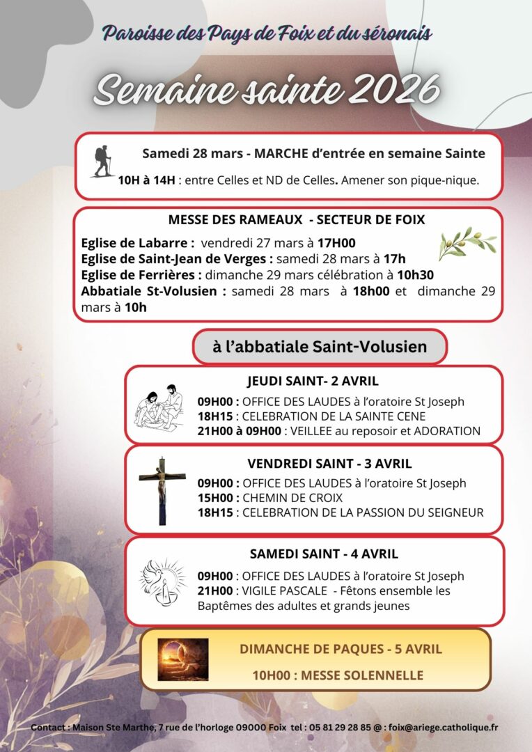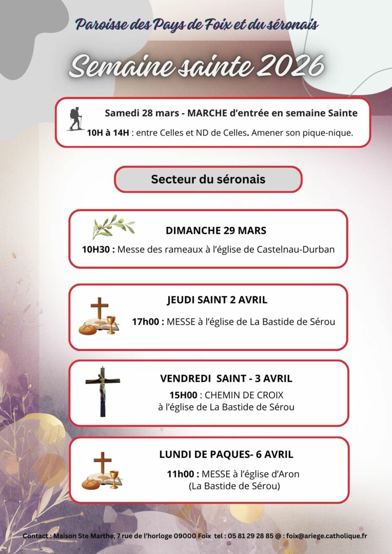 Pendant la Semaine sainte, plusieurs offices seront célébrés dans les églises du secteur de Foix et celui du Séronais. Les affiches éditées ci-dessous en donnent les lieux, dates et horaires. Chaque célébration constitue un itinéraire spirituel qui mène vers la joie de Pâques. Christ est vivant ! Alléluia !