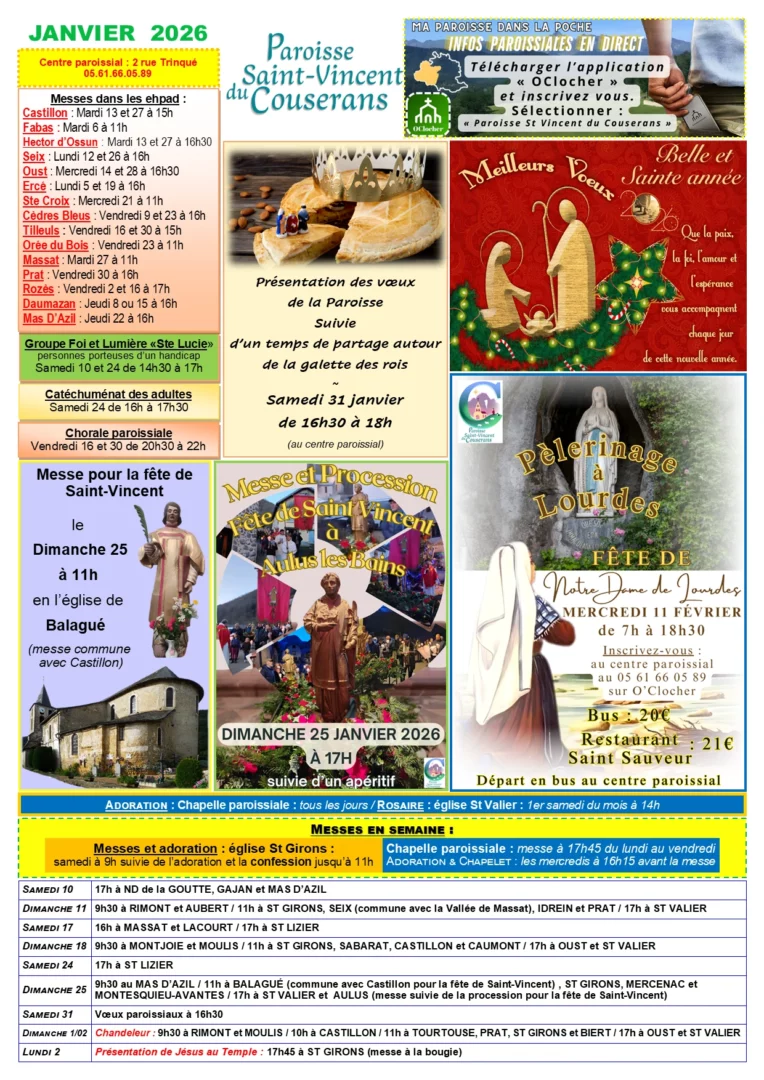 Ce samedi 29 novembre le diocèse était réuni pour une journée jubilaire à Saverdun. Nous étions 500 participants dont 50 jeunes! Au cours de ctte journée notre évêque, Mgr Benoit Gchwind, a annoncé la création de 6 nouvelles paroisses en lieu et place des paroisses existantes. Ainsi nous aurons dorénavent les paroisses de ND des Portes de l'Ariège (Pamiers, Saverdun , Mazères et Vallée de la Lèze), Notre Dame des Trois Rivières (Lavelanet, Mirepoix et Rieucros), Notre Dame du Sabarthès (Tarascon, Les Cabannes, Luzenac et Ax), Saint Martin (Laroques d'Olmes), Pays de Foix et Seronais et pour nous St Vincent du Couserans. Pourquoi St Vincent? St Vincent etait diacre d'un évêque Valere. Il est mort martyr à Saragosse en 305. Ce Valere est-il notre St valier? St Vincent est vénéré chez nous à Aulus et Balagué. Il est vaisemblable qu'il soit passé dans nos montagnes...