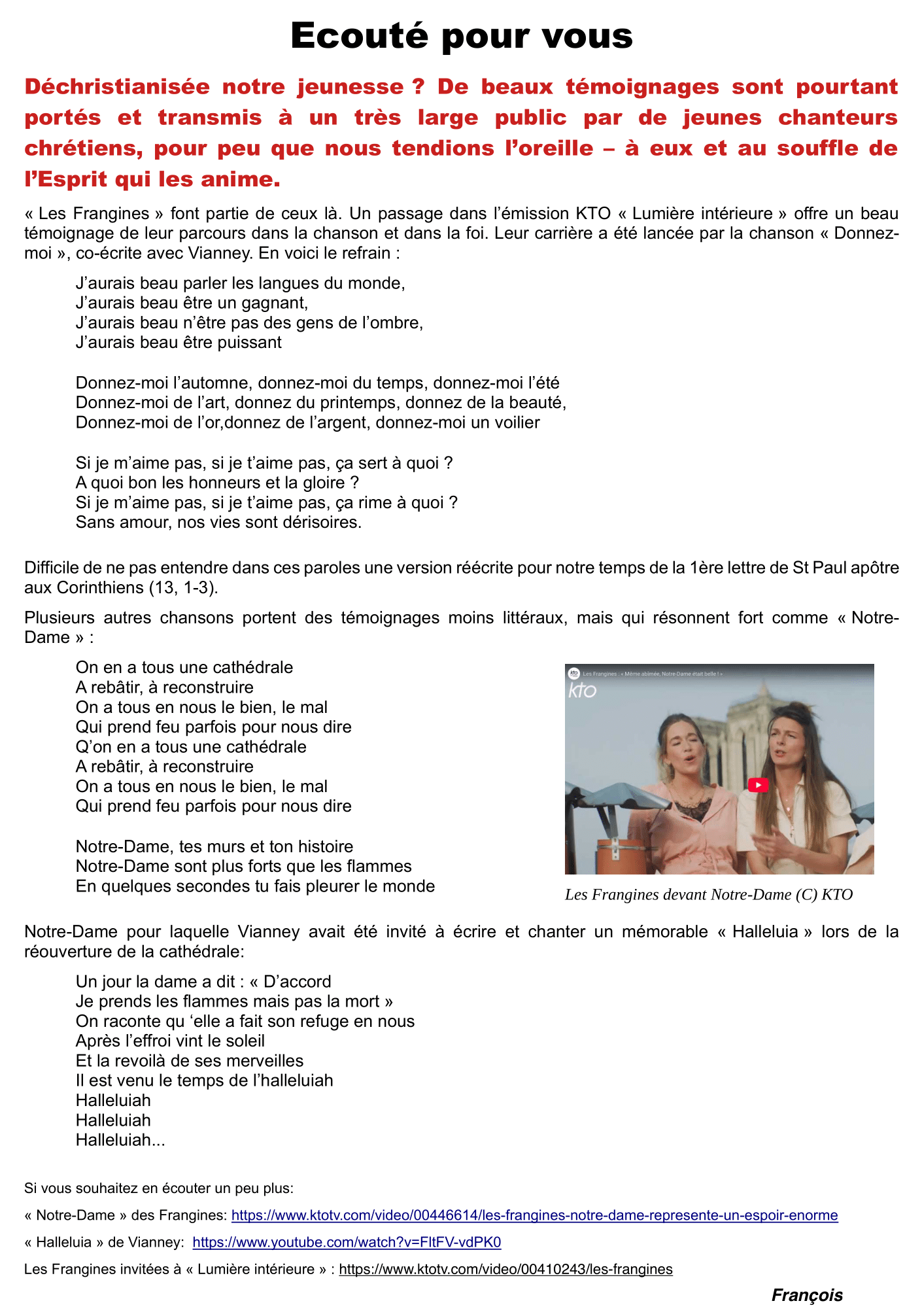 Un enseignement (texte et parfois fichier audio) ou un guide de partage de la parole est proposé chaque semaine pour soutenir la rencontre. A défaut on pourra partager sur l’évangile du dimanche.