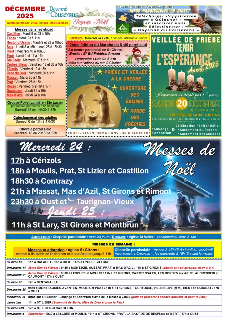 | Dimanche 7/12 2ème dimanche de l’Avent | 9h30 | Rimont et Moulis |